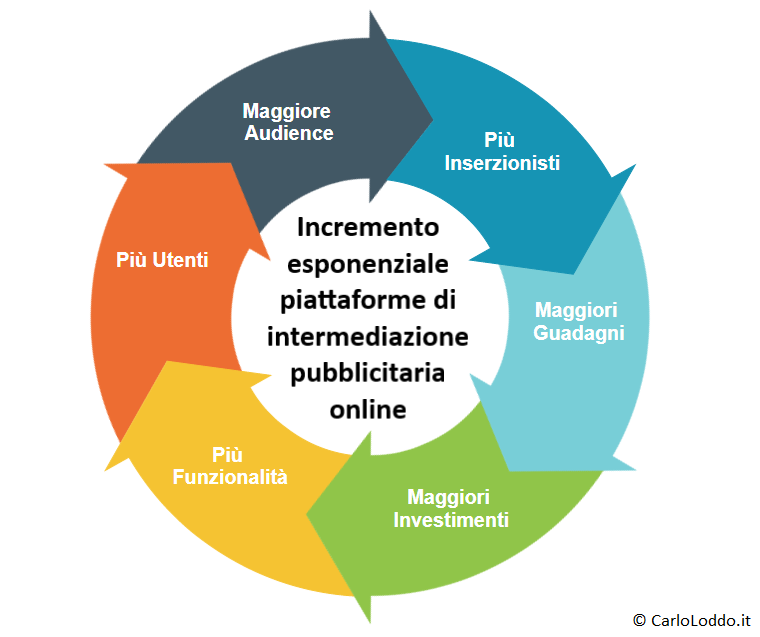 Questo processo, insieme al numero di utenze, ha consentito infatti proprio ai più grandi player internazionali (Google e Facebook soprattutto) di acquisire una posizione di leadership anche nell’intermediazione pubblicitaria attraverso i servizi da loro offerti, rispettivamente nei campi dei motori di ricerca, le app ed i siti web e tra i social network e la messaggistica (Facebook possiede sia Instagram che Whatsapp). Tale posizione è ulteriormente consolidata anche dal fatto che gli inserzionisti tenderanno a rivolgersi a chi ha una potenziale audience maggiore definendo quasi un “circolo vizioso” che attrae tutto e tutti [8].