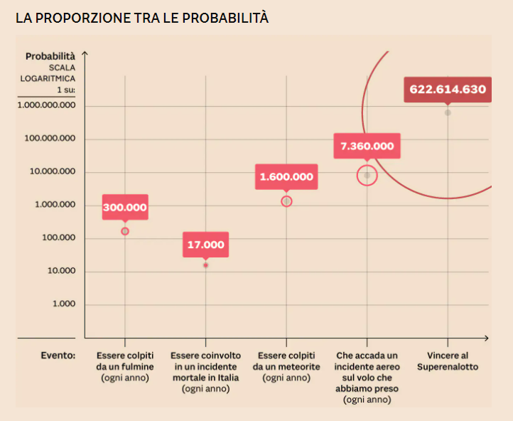 Non so quanta scientificità possano avere, ma ricordo bene di aver letto già in epoca pre-internet in più di un’occasione, forse anche per via della loro sensazionalità mediatica, di diverse stime delle percentuali di probabilità statistica, cioè delle possibilità di concretizzarsi genericamente su ciascuno di noi, relative a molti fenomeni, alcuni dei quali alquanto singolari, come l’essere folgorato da un fulmine, o quasi macabramente bizzarri come essere colpiti da un meteorite, un asteroide od un detrito spaziale, o magari morso da uno squalo, ma di consueto ci si riferisce a questi numeri per esempio banalmente in relazione all’incidenza di varie patologie o casi di mortalità.